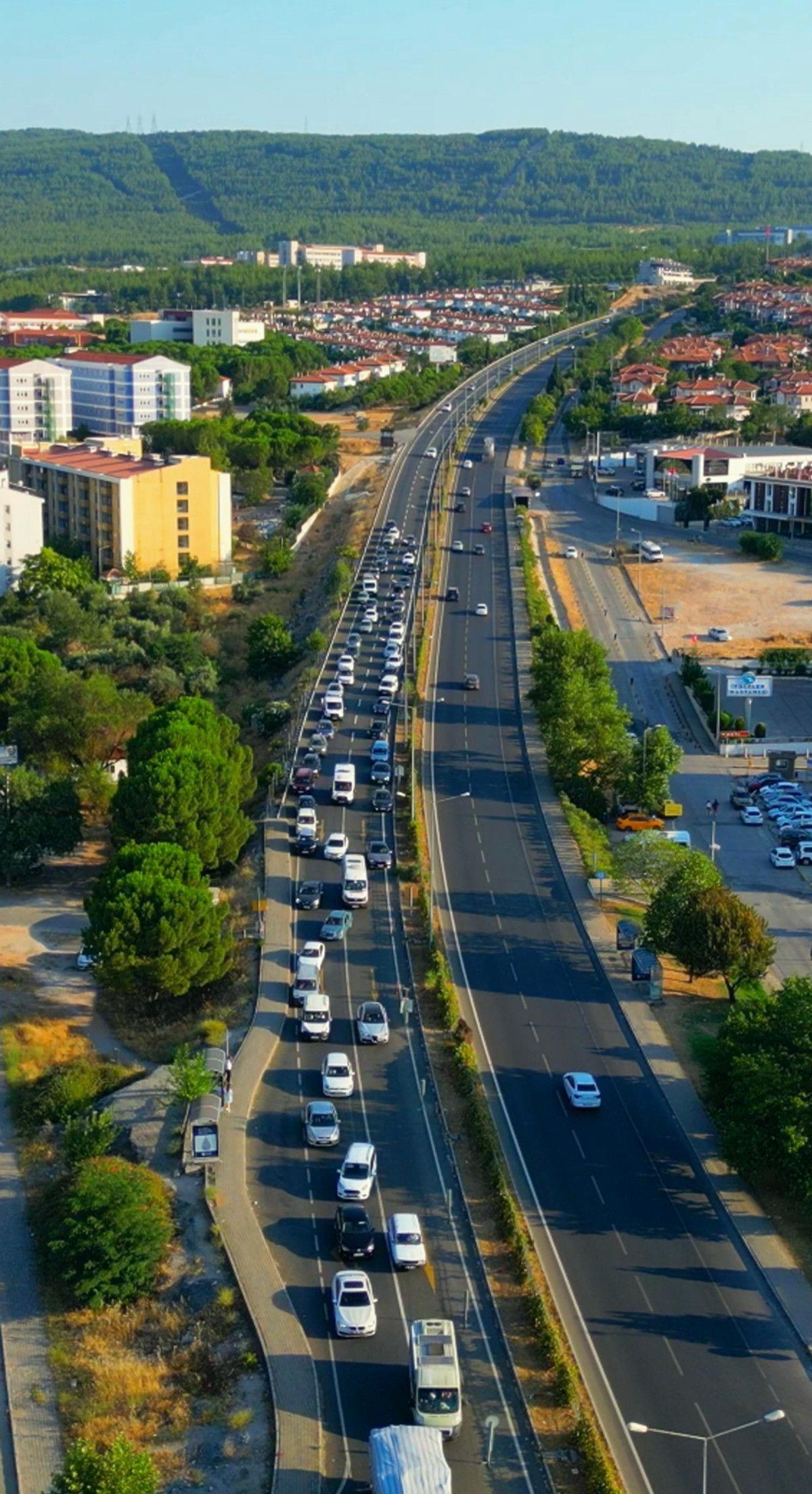 Muğla’nın Menteşe ilçesinde, ambulansların trafikte hızlı ilerlemesi için uygulanan fermuar sistemi ile sürücülerin oluşturduğu hayat koridoru, trafik denetim dronuyla görüntülendi.